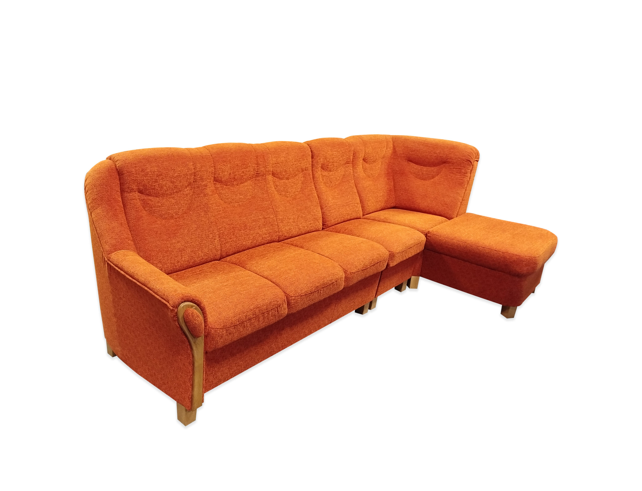 Tato sedací souprava se vyrábí v sestavách dle přání zákazníka v širokém výběru potahových látek a s výběrem odstínů mořených dřevěných prvků.